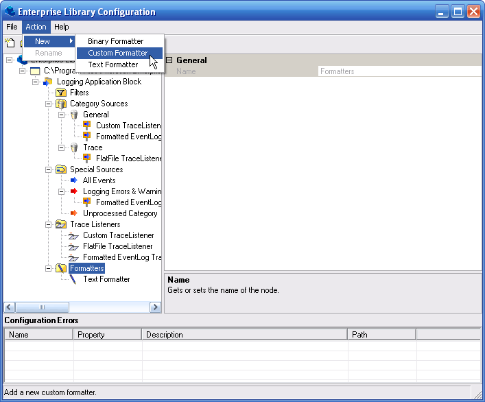 2.選中Logging Application Block | Formatters節(jié)點,選擇Action | New | Custom Formatter菜單命令,并設(shè)置屬性Name的為Xml Formatter。