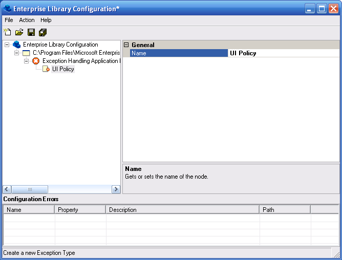 2.選中Exception Handling Application Block節點,選擇Action | New | Exception Policy菜單命令,設置Name屬性為UI Policy。