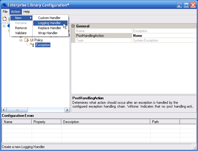 5.選中Exception Handling Application Block | UI Policy | Exception節點,選擇Action | New | Logging Handler菜單命令。