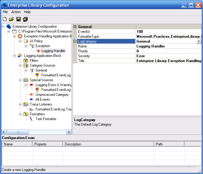 6.選擇Exception Handling Application Block | UI Policy | Exception | Logging Handler節點,并設置如下屬性。