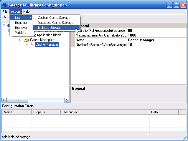 2.選擇Caching Application Block | Cache Managers | Cache Manager節點,選擇Action | New | Isolated Storage菜單命令。