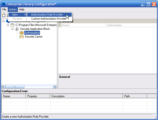 2.添加新的Authorization Rule Provider。選中Security Application Block | Authorization節(jié)點(diǎn),選擇Action | New | Authorization Rule Provider菜單命令。
