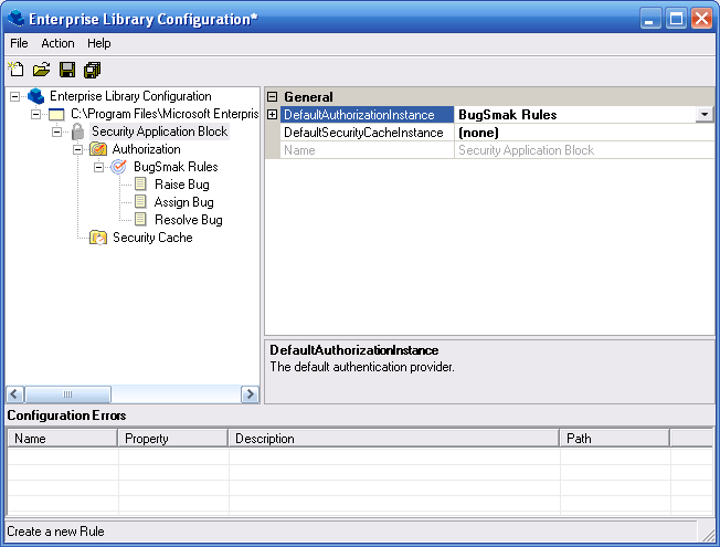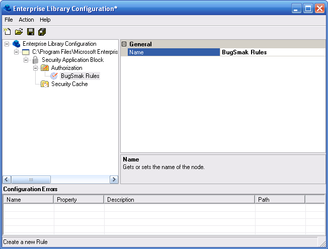 4.選中Security Application Block | Authorization | BugSmak Rules節(jié)點(diǎn),選擇Action | New | Rule菜單命令。
