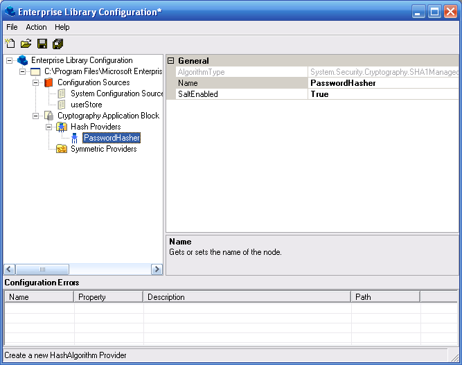6.選擇Cryptography Application Block | Hash Providers | SHA1Managed節點,并設置如下屬性。