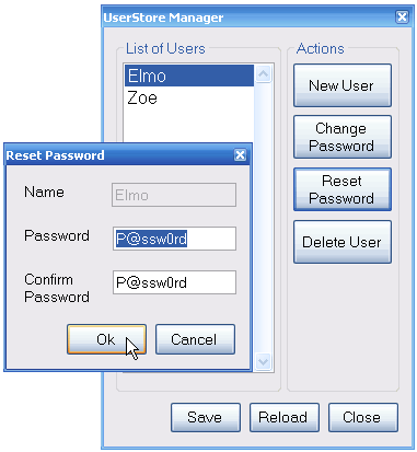 6.重新設置用戶Elmo和Zoe的密碼,選中用戶后,單擊Reset Password按鈕。