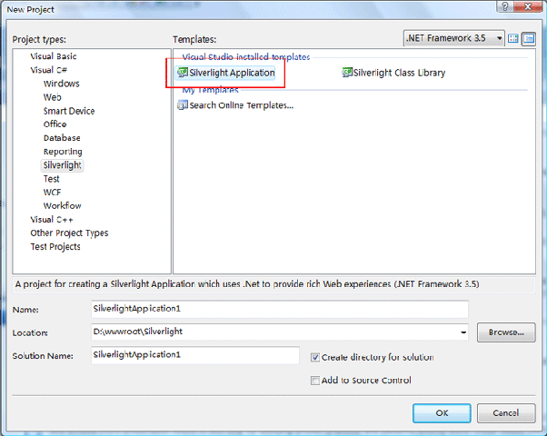 安裝完Silverlight 2 Beta 1之后打開VS2008,打開新建項(xiàng)目對(duì)話框,可以看到Silverlight Application項(xiàng)目模板。