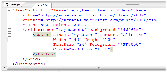 現(xiàn)在我們創(chuàng)建一個(gè)簡(jiǎn)單的Hello Word Silverlight程序,使用如下XAML創(chuàng)建一個(gè)簡(jiǎn)單的按鈕: