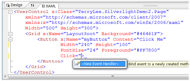 為按鈕添加Click事件,在XAML編輯器中輸入事件名稱Click之后,再按Tab鍵將會(huì)使用默認(rèn)的命名方法生成事件處理方法: