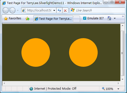 <Canvas Background="#46461F"> <Ellipse x:Name="ellipse1" Width="120" Height="120" Fill="Orange" Canvas.Top="60" Canvas.Left="80"/> <Ellipse x:Name="ellipse2" Width="120" Height="120" Fill="Orange" Canvas.Top="60" Canvas.Left="280"/> </Canvas>