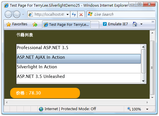 public partial class Page : UserControl { public Page() { InitializeComponent(); } void UserControl_Loaded(object sender, RoutedEventArgs e) { List<Book> books = new List<Book>() { new Book("Professional ASP.NET 3.5"), new Book("ASP.NET AJAX In Action"), new Book("Silverlight In Action"), new Book("ASP.NET 3.5 Unleashed"), new Book("Introducing Microsoft ASP.NET AJAX") }; Books.ItemsSource = books; } void Books_SelectionChanged(object sender, SelectionChangedEventArgs e) { Uri endpoint = new Uri(String.Format("http://localhost:49955/BookHandler.ashx?No={0}",Books.SelectedIndex)); WebClient client = new WebClient(); client.DownloadStringCompleted += new DownloadStringCompletedEventHandler(client_DownloadStringCompleted); client.DownloadStringAsync(endpoint); } void client_DownloadStringCompleted(object sender, DownloadStringCompletedEventArgs e) { if (e.Error == null) { lblPrice.Text = "價格:" + e.Result; } else { lblPrice.Text = e.Error.Message; } } }