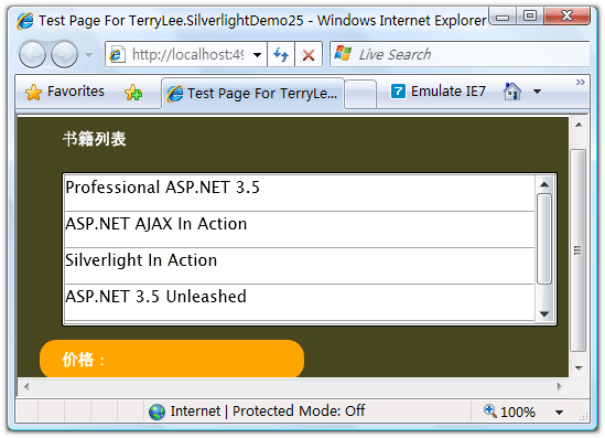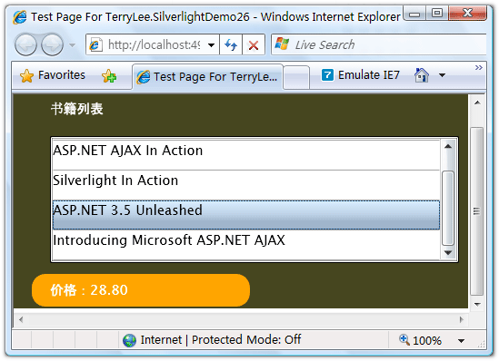 在本文中,我們仍然使用在一步一步學Silverlight 2系列(12):數據與通信之WebClient中用過的示例,只不過稍微做一點小的改動,使用WebRequest提交書籍編號數據,并根據書籍號返回價格信息。最終運行的結果如下圖: