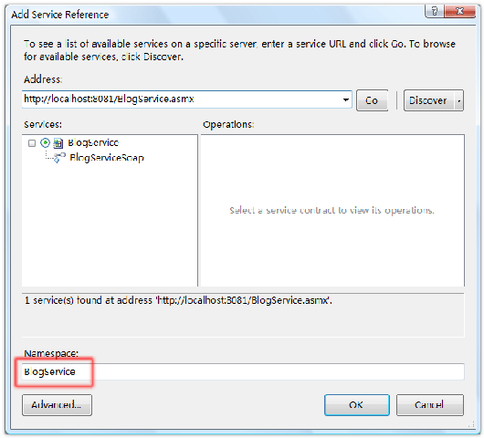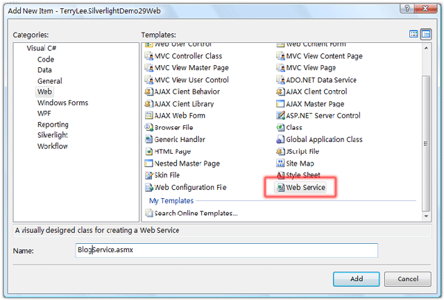 在Web項目中添加一個Web Service文件,命名為BlogService.asmx