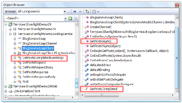 public partial class Page : UserControl { public Page() { InitializeComponent(); } private void UserControl_Loaded(object sender, RoutedEventArgs e) { BlogServiceSoapClient client = new BlogServiceSoapClient(); client.GetPostsCompleted += new EventHandler<GetPostsCompletedEventArgs>(client_GetPostsCompleted); client.GetPostsAsync(); } void client_GetPostsCompleted(object sender, GetPostsCompletedEventArgs e) { if (e.Error == null) { Posts.ItemsSource = e.Result; } } }