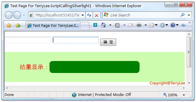 看一個簡單的示例,在這個示例中,我們期望通過JavaScript傳遞兩個參數給Silverlight中的方法,由該方法計算出結果后顯示在Silverlight中,如圖所示: