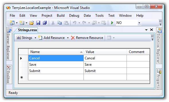我們發(fā)現(xiàn)在Silverlight 2中提供了ResourceManager類,這意味著可以通過(guò)資源文件來(lái)實(shí)現(xiàn),首先在Silverlight項(xiàng)目中建立一個(gè)文件夾,命名為Resources,添加一個(gè)資源文件Strings.resx,并添加幾個(gè)值,如下圖所示: