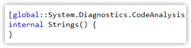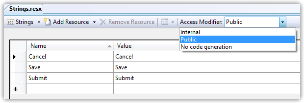 很明顯Strings類型的構(gòu)造函數(shù)訪問(wèn)性不是public,打開(kāi)Strings.Design.cs文件可以看到,它的構(gòu)造函數(shù)是internal的,這一點(diǎn)好辦,手工修改為public(也許該問(wèn)題將會(huì)在RTM中解決)。但是要注意,每次當(dāng)修改完Resource文件后,它會(huì)再次變?yōu)閕nternal類型。