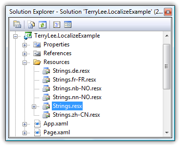 現(xiàn)在再創(chuàng)建幾個(gè)其它語(yǔ)言的資源文件,如中文、法語(yǔ)、挪威語(yǔ)等,注意資源文件的命名方式,都是以Strings+語(yǔ)言文化構(gòu)成,有關(guān)每一種語(yǔ)言文件的代碼,大家可以查閱MSDN。