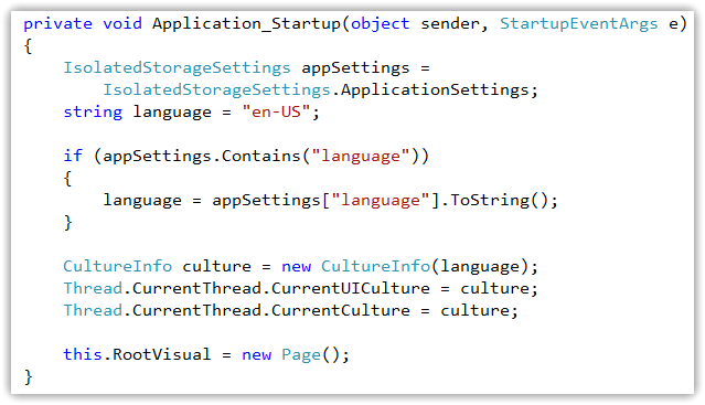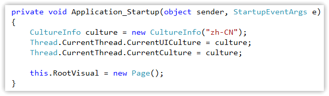 最后我們只剩下一步工作,就是指定當(dāng)前線程的語(yǔ)言文化和UI語(yǔ)言文化,這一點(diǎn)我們可以在Application_Startup事件中來(lái)實(shí)現(xiàn),我們?cè)O(shè)置為zh-CN,如下代碼所示: