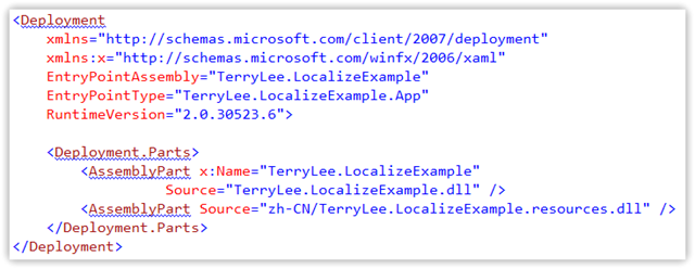 在xap文件中,除了Silverlight項(xiàng)目程序集之外,并沒(méi)有任何與資源文件有關(guān)的東西。有一種“暴力”的辦法可以解決這個(gè)問(wèn)題,那就是我們拷貝Silverlight項(xiàng)目bin\Debug文件夾下的資源文件,手工進(jìn)行打包xap文件,并且需要在xap文件的AppManifest.xaml文件夾中手工加入AssemblyPart,如下代碼所示: