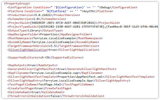 我們打開(kāi)Silverlight項(xiàng)目文件(.csproj),可以看到有SupportedCultures這樣一項(xiàng),如果在這里進(jìn)行了設(shè)置,再編譯Silverlight項(xiàng)目時(shí)將會(huì)自動(dòng)打包資源文件,如下圖所示,我們添加一項(xiàng)zh-CN:
