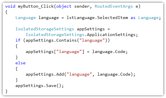 現(xiàn)在我們要實(shí)現(xiàn)本地存儲(chǔ)功能,這個(gè)不是什么難事,可以通過(guò)Silverlight 2中的隔離存儲(chǔ)來(lái)實(shí)現(xiàn)。在用戶選擇一種語(yǔ)言后保存到本地: