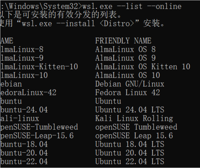 此時,通過執行如下指令查詢可用的WSL分發列表(可能需要魔法上網才行)