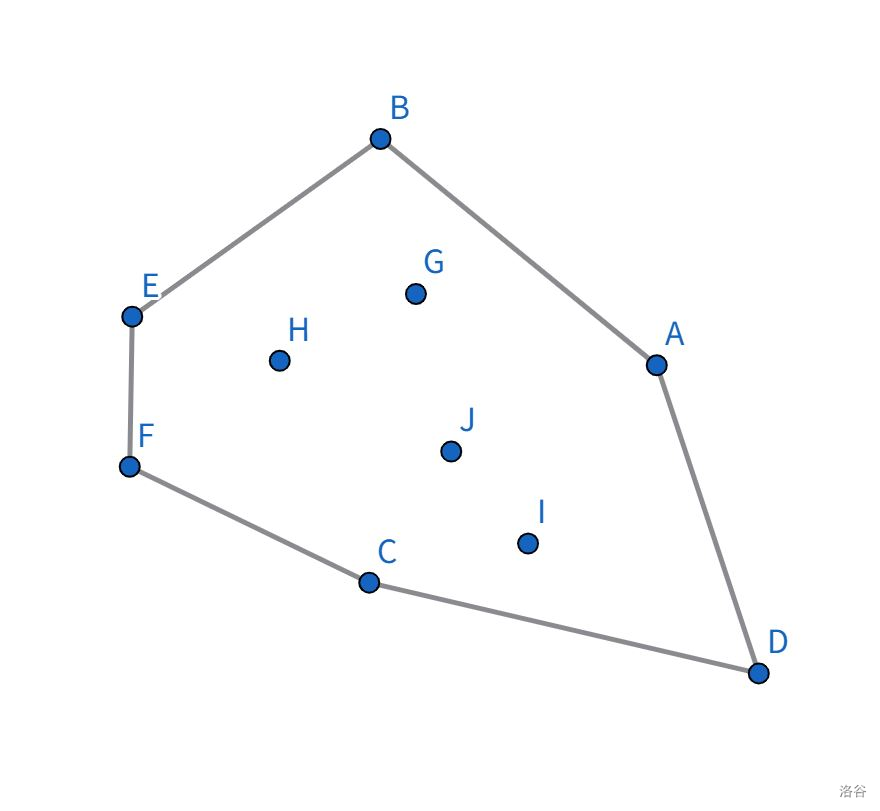 在這張圖片里,一個平面上有數個點,同時還有一個凸多邊形將這數個點完全覆蓋,那么使這個圖形面積最小的凸多邊形就稱為凸包。更具象化地講,就是用手撐開一個橡皮筋并用其把一堆釘子圍住,然后再松開手使橡皮筋收縮,那么最終橡皮筋形成的圖形便是這些釘子的凸包。