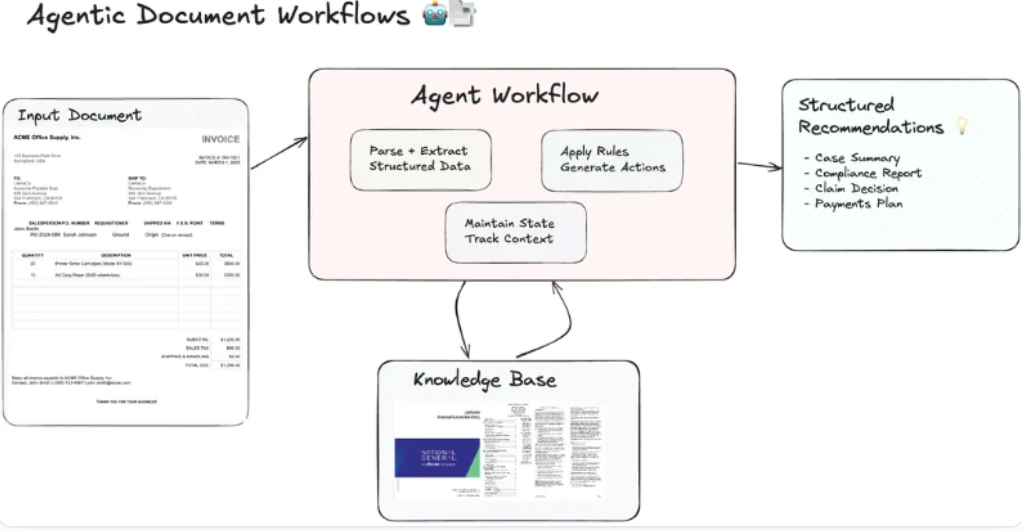 Agentic Document Workflows(ADW)通過實現端到端的知識工作自動化,擴展了傳統的 RAG 范式。這些工作流程協調以文檔為中心的復雜過程,集成了文檔解析、檢索、推理和結構化輸出,并與智能代理結合。ADW 系統通過維護狀態、協調多步驟工作流程以及對文檔應用特定領域的邏輯,**解決了智能文檔處理(Intelligent Document Processing,IDP)和 RAG 的局限性**。