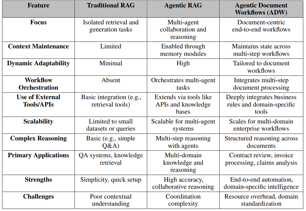 表2提供了三種架構框架的全面比較分析:傳統檢索增強生成(Traditional RAG)、代理式檢索增強生成(Agentic RAG)和代理式文檔工作流(Agentic Document Workflows,ADW)。該分析突出了它們各自的優點、缺點以及最適合的場景,為它們在各種不同用例中的適用性提供了寶貴的見解。