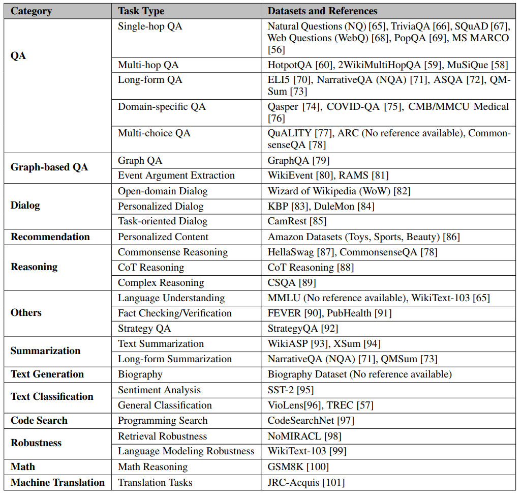 當前的基準測試和數據集為評估檢索增強生成(RAG)系統提供了寶貴的見解,包括具有代理和基于圖的增強功能的系統。雖然其中一些是專門為RAG設計的,但其他一些則被改編用于在不同場景中測試檢索、推理和生成能力。數據集對于測試RAG系統的檢索、推理和生成組件至關重要。表3討論了一些基于下游任務的RAG評估的關鍵數據集。基準測試在標準化RAG系統的評估中發揮著關鍵作用,通過提供結構化的任務和指標。以下基準測試特別相關: