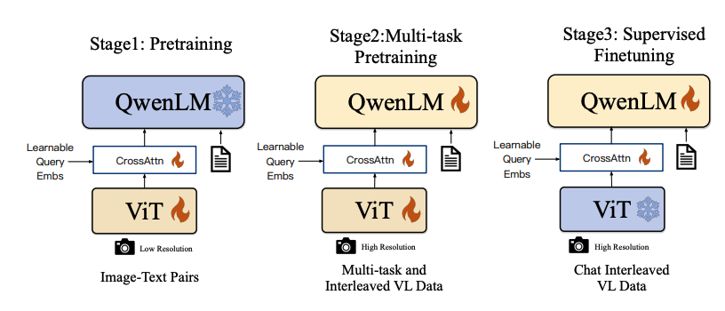 架構:以Qwen-LM作為大型語言模型基座,視覺編碼器采用Openclip ViT-bigG,通過交叉注意力層與LLM集成。