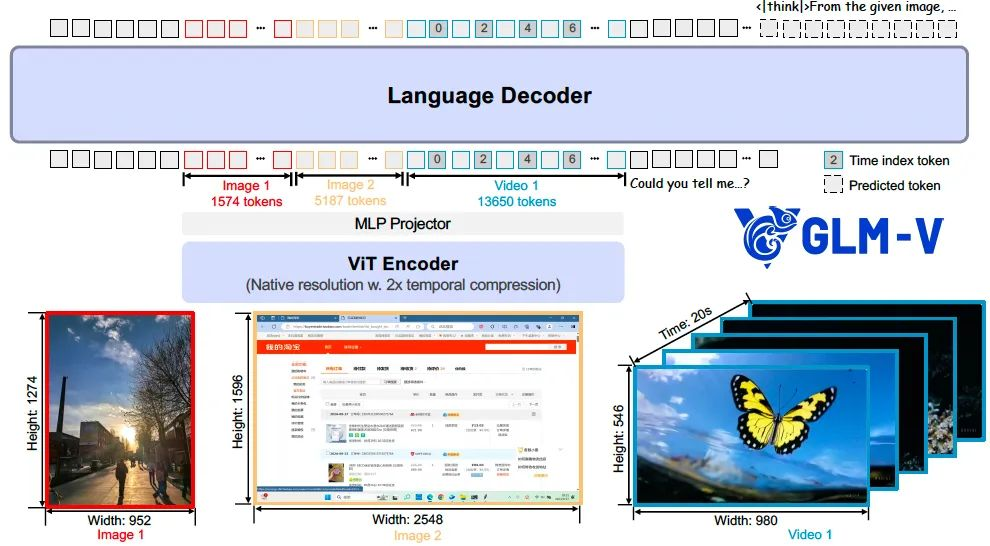 GLM-4.1V-Thinking 模型架構由三個核心模塊組成:視覺編碼器(ViT Encoder)、多層感知機適配器(MLP Projector)以及語言解碼器(Language Decoder)。