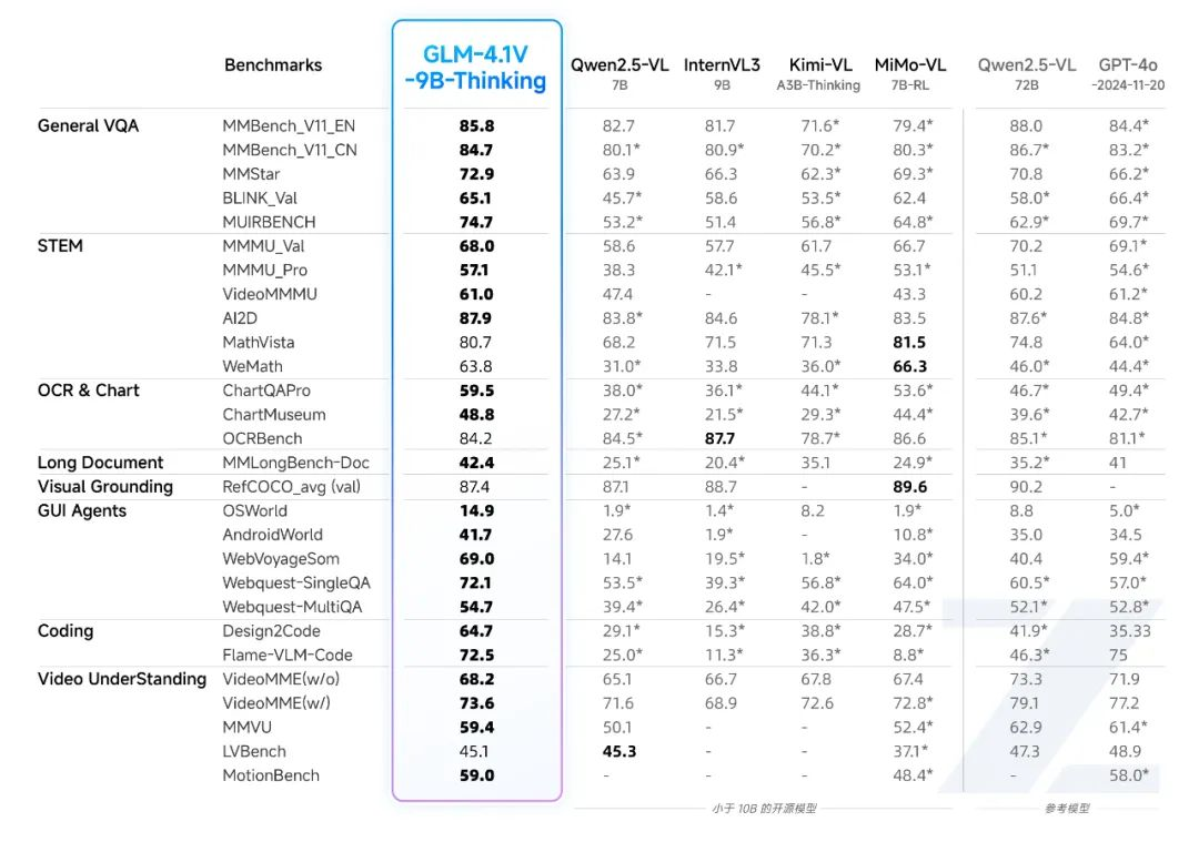 由智譜AI與清華大學聯合研發,采用Reinforcement Learning with Curriculum Sampling (RLCS)訓練框架,通過大規模預訓練構建高潛力基礎模型,結合監督微調和強化學習,實現跨任務能力提升。在28個公共基準測試中,該模型**(9B參數)**幾乎全面超越Qwen2.5-VL-7B,在18項任務上媲美甚至優于更大規模的Qwen2.5-VL-72B,并在長文檔理解、STEM推理等任務上與GPT-4o表現相當或更優。論文:GLM-4.1V-Thinking: Towards Versatile Multimodal Reasoning with Scalable Reinforcement Learning