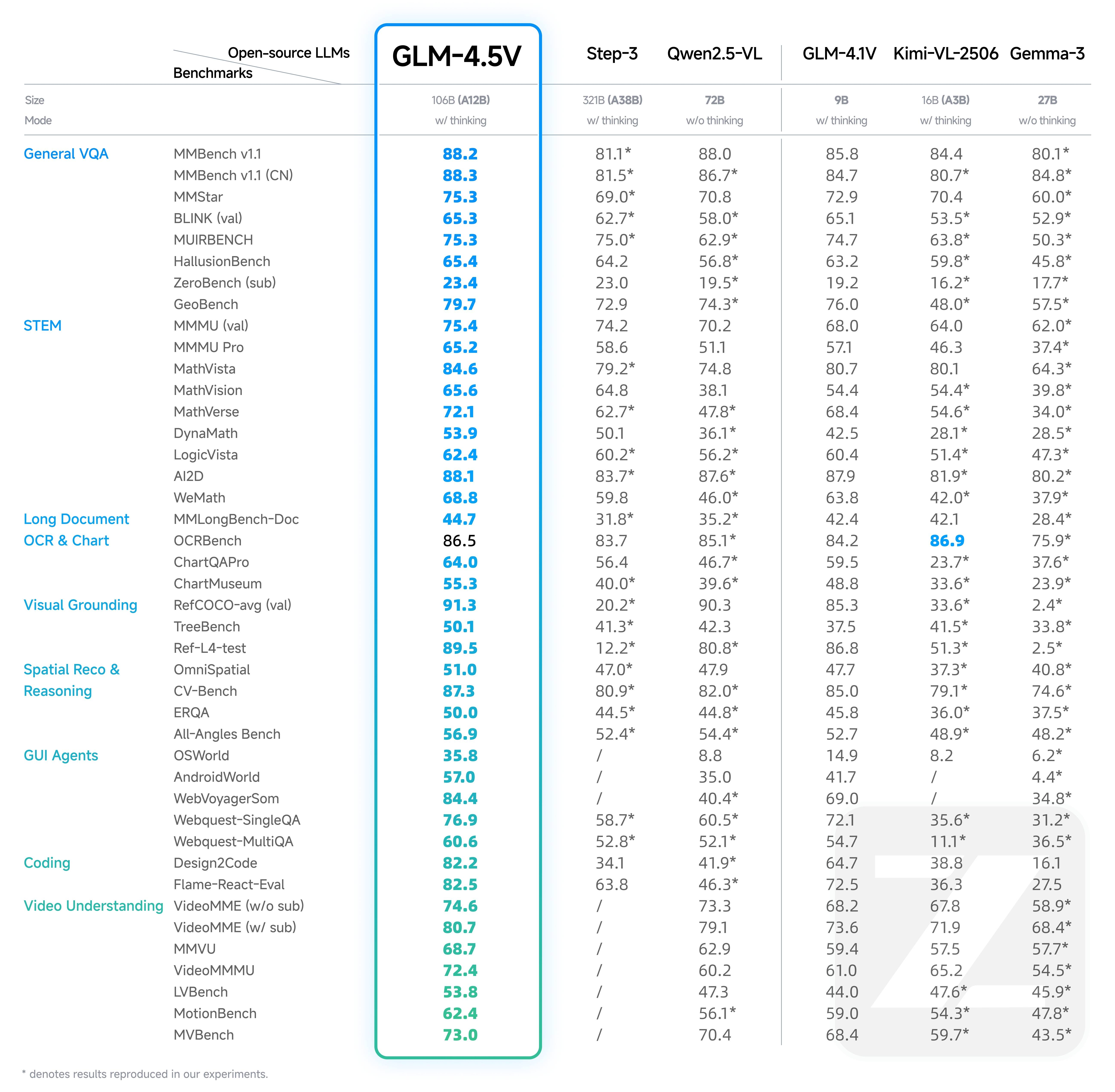 發布GLM-4.1V-9B-Thinking和GLM-4.5V兩個模型,其中GLM-4.5V是一個參數量106B,激活12B的MOE結構的模型,且包含thinking和non-thinking兩個。其中比較有亮點的是GLM-4.1V-9B-Thinking一個9B的模型在29個Benchmark上超過了Qwen2.5- VL -72B(non-thinking模型)。大模型的發展方向有兩個,一個往大的方向發展:不斷的探索scaling law。一個是往小的方向發展:參數量比較你小,但是性能比你好。所以GLM-4.1V-9B-Thinking一個9B參數的模型在多個方面超過一個72B的模型,還是很令人吃驚的。