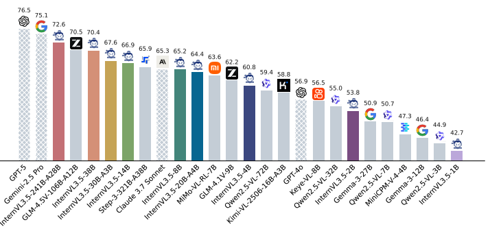 - 綜合性能與影響:InternVL 3.5,尤其是其最大的InternVL3.5-241B-A28B模型,在包括通用多模態理解、復雜推理、純文本任務以及智能體任務在內的廣泛基準測試中,取得了開源模型中的最先進(SOTA)性能。