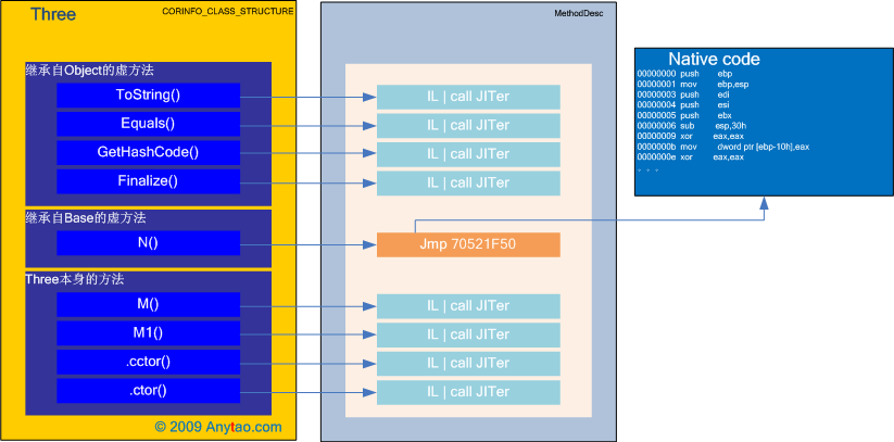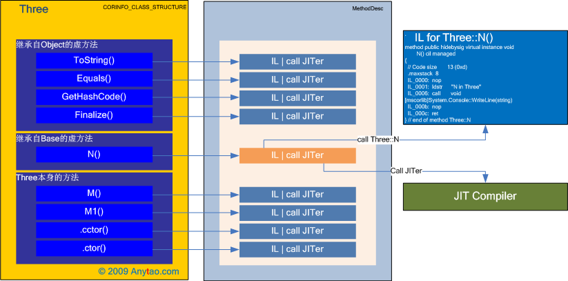 Note: 在本例中Three沒有定義任何靜態方法,其方法表中父類方法N已有子類覆寫,同時因為有靜態成員存在的原因,CLR會自動創建類型構造器,詳細情況可參考《你必須知道的.NET》1.2節 “什么是繼承”。