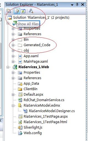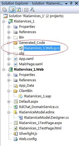 這個RiaServices_1.Web.g.cs,是服務端RdChat_DomainService.cs的對應客戶端版本。它包含了所有服務端版本類中定義的方法、實體等,而可在客戶端直接調用。它打代碼如下:
