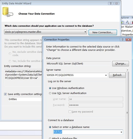 - 選擇SQL Server2005里的數據庫和表。VS會幫我們生成一個ADO.NET的實體(Entity)。