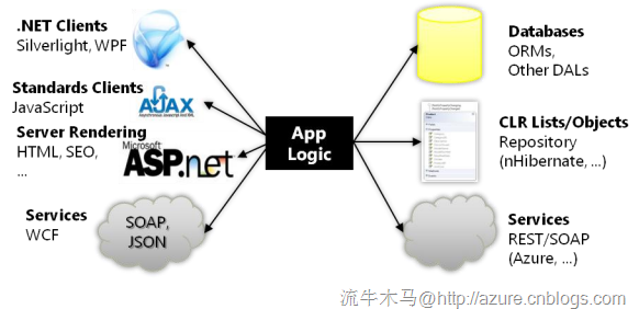 上圖展示了微軟在RIA與數據庫交互上的宏偉構想:無論是Silverlight,WPF,Javascript,還是ASP.NET,WCF,它們都應該使用無差別的數據邏輯,能夠直接訪問到數據層面,而不需要通過一層類似“代理”的數據服務。