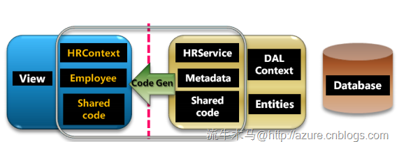 以上就是.NET RIA Services的實現原理。開發者在ASP.NET端的數據處理類(本圖中是HRService)繼承自一個叫做DomainService的類,在里面實現一些數據操作。.NET RIA Services就會自動生成相應的客戶端類(本圖中是HRContext)。而在我們開發客戶端的時候,我們就可以直接調用.NET RIA Services生成的那個類,直接操作數據層面。