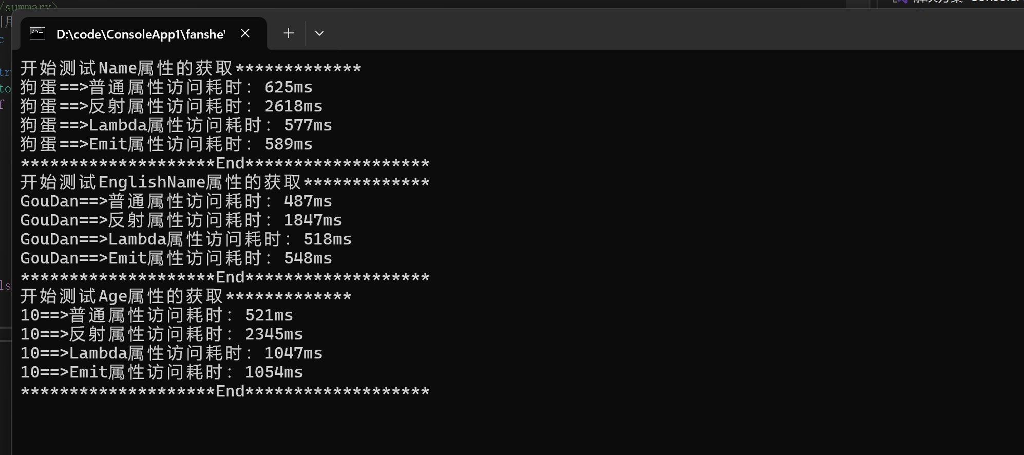 Console.WriteLine($"{result}==>Emit屬性訪問耗時:{stopwatch.ElapsedMilliseconds}ms");