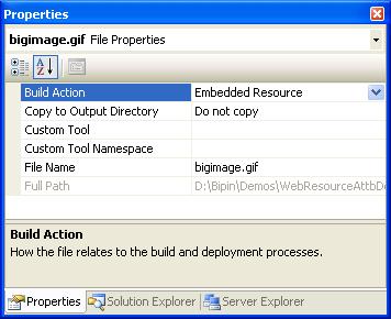 You can also embed files directly in the assembly by setting its Build Action to" Embedded Resource". Figure 1 shows the VS.NET property window for an image file with this option.