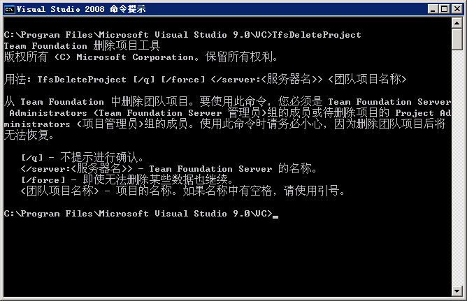 從團隊資源管理界面上找不到刪除團隊項目的功能, 只能使用命令行工具 TfsDeleteProject ,打開Visual Studio 2008 命令行提示,輸入TfsDeleteProject, 如下圖所示.