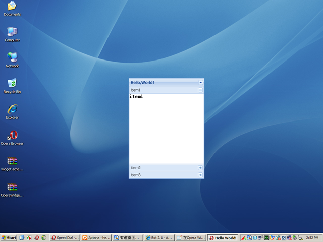 參考了opera官方的一些文檔,做了一個(gè)簡(jiǎn)單的HelloWorld的Opera Widget,用Opera 9.5 來(lái)運(yùn)行,效果不錯(cuò)。初一看,給人的感覺(jué)是ExtJS離開(kāi)了瀏覽器,直接在桌面上運(yùn)行了。(可惜的是,widget無(wú)法脫離opera運(yùn)行,opera必須開(kāi)著。)