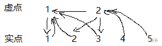 (這張圖代表的是實點 \(1\) 到 \(3\) 的前綴區間為 \([1,1]\),實點 \(4\) 到 \(5\) 的前綴區間為 \([1,3]\) 時的連邊情況,其中虛點 \(1\) 代表實點區間 \([1,1]\),虛點 \(2\) 代表實點區間 \([1,3]\))