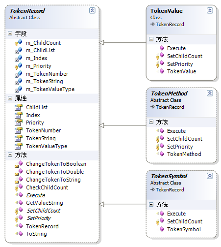 按照上面對操作元素的分類,從TokenRecord類衍生出一下幾個類:TokenValue(對應字符串和數值),TokenMethod(方法類,抽象類,對應部分關鍵字而非全部,因為有些關鍵字是常量,可以用TokenValue表示), TokenSymbol(對應運算符,抽象類)。類圖如下: