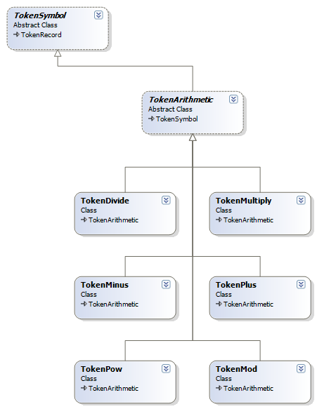 接下來是如何實現具體的TokenRecord類。以乘法記號類TokenMultiply為例,TokenMultiply繼承自TokenArithmetic,TokenArithmetic繼承自TokenSymbol,TokenSymbol繼承自TokenRecord。