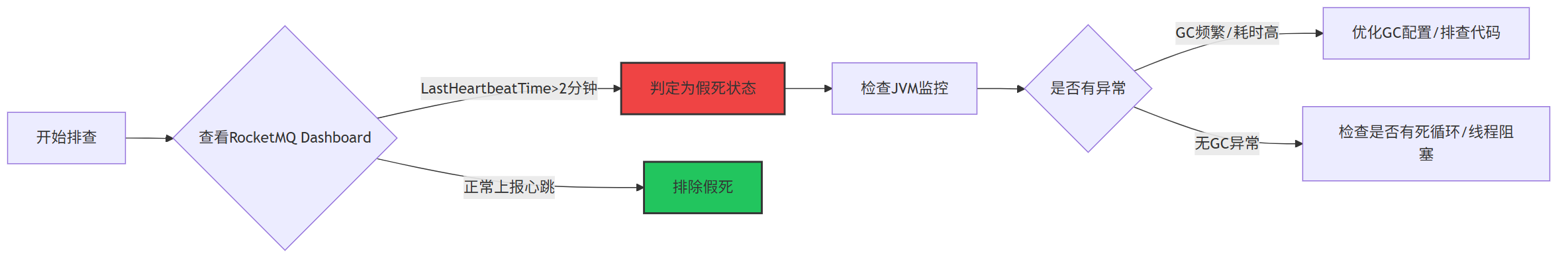 打開RocketMQ Dashboard(運維必備工具),查看Consumer分組的“在線客戶端”列表。若某臺服務器的Consumer長時間未上報心跳(LastHeartbeatTime超過2分鐘),大概率是“消費者假死”。