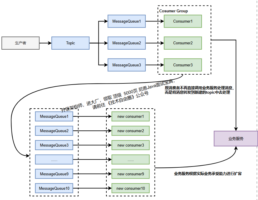 對應擴容Consumer(10倍),每個Consumer消費一個臨時隊列,同時擴容依賴的業務服務(如緩存、數據庫);